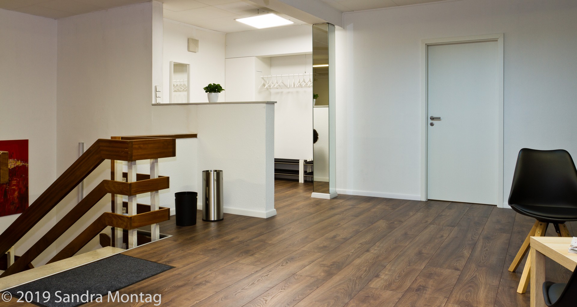 Im großen Eingangsbereich auf der ersten Etage erwartet Sie eine gemütliche Wartelounge mit Garderobe und Toilette.